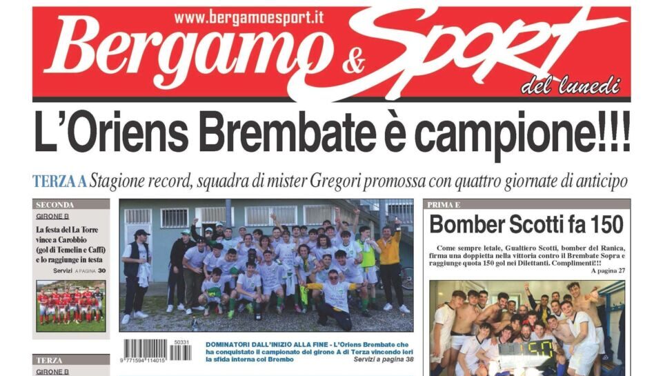 Celebriamo i primi campioni della stagione calcistica 2024-2025! Dopo un’annata a dir poco fantastica, i ragazzi dell’Oriens Brembate battono il Brembo e conquistano il Girone A di Terza Categoria salendo in Seconda. A loro è dedicata la prima pagina di Bergamo & Sport, il settimanale dei calciatori della nostra provincia, pubblicazione che potete acquistare o dal vostro giornalaio di fiducia o tramite la nostra edicola digitale cliccando dalle sei di mattina su www.bergamoesport.it/abbonamenti. Tanti i temi caldi in questa domenica di fine marzo. Iniziamo: salgono a dismisura le quotazioni di San Paolo d’Argon (Prima E), La Torre (Seconda B) e Ponteranica (Terza B) di conquistare i rispettivi campionati dopo le vittorie nei big match di giornata. Poi, in evidenza, Gualtiero Scotti, bomber letale (e ragazzo dalla simpatia contagiosa), arrivato a quota 150 gol nei dilettanti dopo la decisiva doppietta che ha portato il suo Ranica (Prima E) a vincere l’importante sfida col Brembate Sopra. Complimenti! Molte le partite seguite, moltissimi gli approfondimenti, su tutti quelli sulle camminate record andate in scena domenica mattina a Ponte e a Urgnano. Questo e altro sul nostro settimanale e noi ci congediamo col solito consiglio: non importa dove, non importa come e non importa quando, ma comperate Bergamo & Sport.
