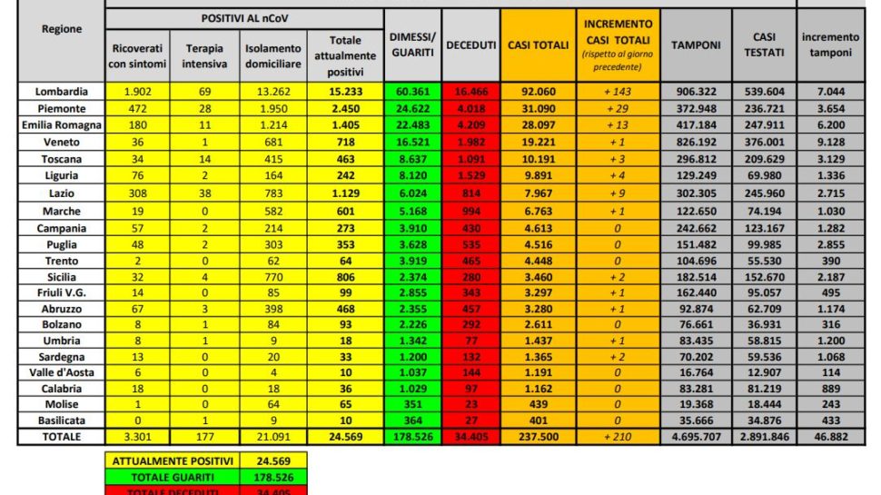 Rispetto a ieri i deceduti sono 34 e portano il totale a 34.405. Il numero complessivo dei dimessi e guariti sale invece a 178.526, con un incremento di 1.516 persone rispetto a ieri.
