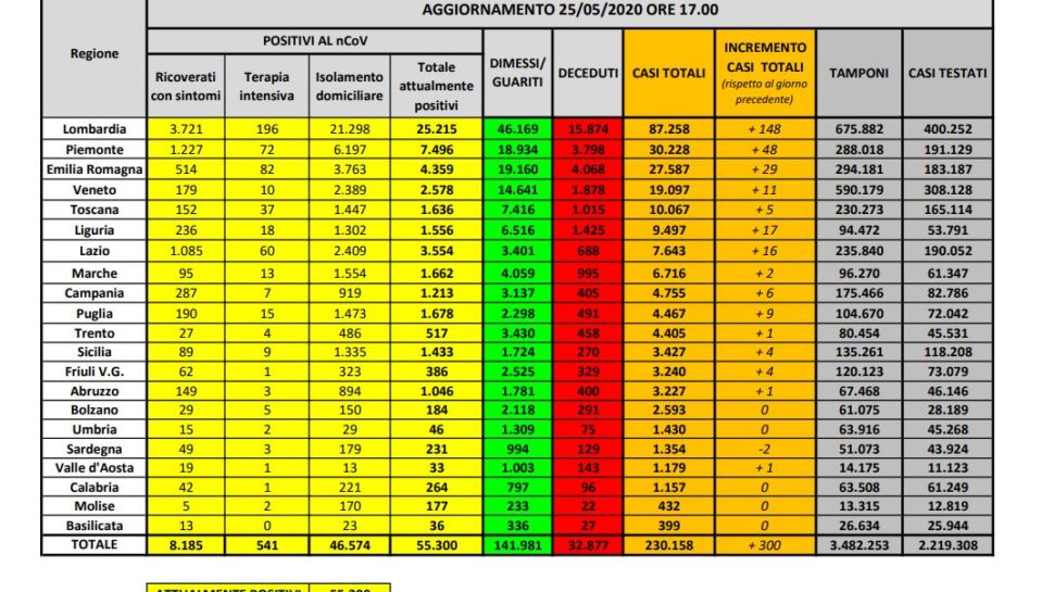 Bollettino nazionale del 25 maggio, il totale delle persone attualmente positive ammonta a quota 55300 (-1294 rispetto a domenica). Dall’inizio dell’epidemia sono 230158 le persone colpite da Covid-19 in Italia. I nuovi casi registrati nelle ultime 24 ore sono 300 a fronte di 35.241 tamponi processati (ieri i nuovi casi erano 531 a fronte di 55.824 tamponi processati). I decessi registrati nelle ultime 24 ore sono 92 (32.877 il totale). Si registrano inoltre 1.502 pazienti guariti (141.981 il totale). Calano le terapie intensive (si passa da 553 a 541, -12) e i ricoveri non in terapia intensiva (si passa da 8.613 a 8.185, -428). Le persone sottoposte a tampone dall’inizio dell’epidemia sono 2.198.632.