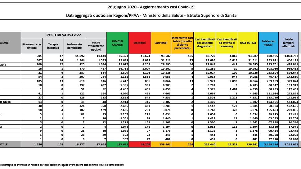 Bollettino nazionale del 26 giugno, sono 259 i nuovi casi riscontrati nelle ultime 24 ore sul territorio italiano. I decessi registrati nell’ultima giornata sono 30 (34708 il totale), i guariti 890 (187615 il totale). Le persone attualmente positive sono 17638: di questi, 16177 si trovano in isolamento domiciliare, senza sintomi o con sintomi lievi. 1356 sono gli ospedalizzati con sintomi e 105 le persone in terapia intensiva.