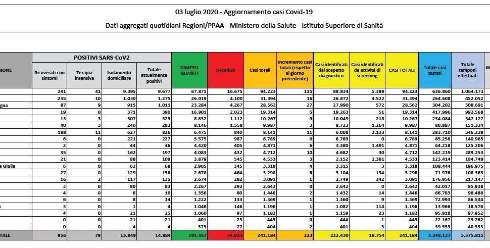 Bollettino nazionale del 3 luglio, i nuovi casi registrati nelle ultime 24 ore sono 223 a fronte di 77.096 tamponi processati. Le persone colpite da Covid-19 dall’inizio dell’epidemia sono 241.184. Gli attualmente positivi sono 14.884 (-176 rispetto a ieri). I decessi registrati nelle ultime 24 ore sono 15 (34.833 il totale), i guariti e i dimessi sono 384 (191.467 il totale). Calano i ricoverati in terapia intensiva (-3), così come i ricoverati con sintomi (-7). Nessun nuovo caso si è registrato nelle ultime 24 ore nelle Marche, nella provincia autonoma di Bolzano e in Molise. Clicca sull’immagine qui sotto per visualizzare la tabella del Ministero della Salute.