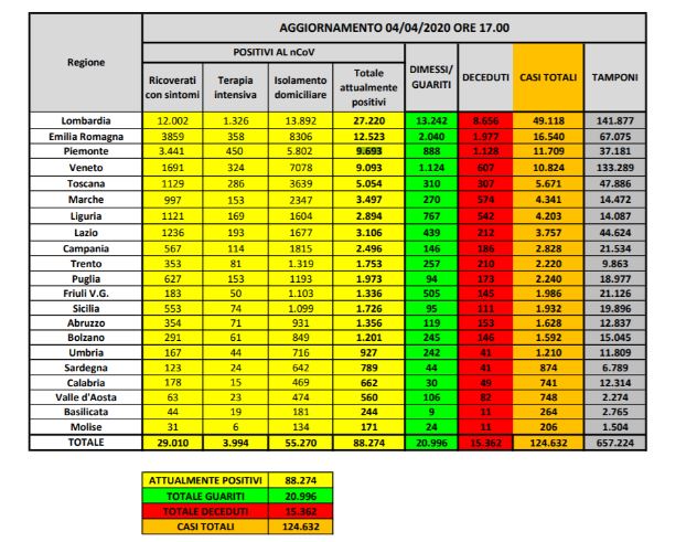 sabato 4 Aprile 2020Bollettino nazionale del 4 aprile, anche il sabato conferma dati costanti