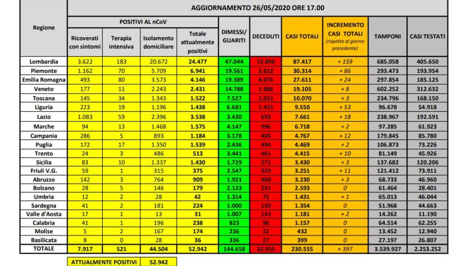 Bollettino nazionale del 26 maggio, gli attuali positivi sono 52942 (-2358 rispetto a lunedì). Dall’inizio dell’epidemia sono 230555 le persone colpite da Covid-19 in Italia, i nuovi casi registrati nelle ultime 24 ore sono 397. Si registrano 78 decessi (32955 il totale) e 2677 guariti (144658 il totale). Nelle ultime 24 ore sono stati processati 57.674 tamponi. Diminuiscono le persone ricoverate con sintomi (sono 7917, -268 rispetto a ieri) e quelle ricoverate in terapia intensiva: sono 521, 20 in meno rispetto a ieri).