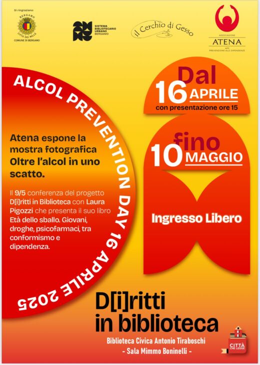 Sarà presentata domani 16 aprile, in occasione di ‘Alcohol Prevention Day 2025’, (aprile è il mese della prevenzione alcologica) presso la Biblioteca Civica Tiraboschi di Bergamo la mostra fotografica “Oltre l’alcol in uno scatto” che quest’anno celebra dieci anni da quando il concorso per giovani studenti bergamaschi fu lanciato per riflettere sull’abuso di alcol tra i minorenni e per prevenire un fenomeno in grande e preoccupante crescita, anche nella nostra città e provincia. Ideata da Associazione Atena nel 2015, con una prima edizione al Chiostro di Santa Marta a Bergamo e una seconda edizione post covid nel 2022, quest’anno ne viene presentata un’edizione speciale all’interno della manifestazione “D[i]ritti in Biblioteca”, incentrata sul tema della violenza di genere e delle pari opportunità, in collaborazione con il Comune di Bergamo con il Sistema Bibliotecario Urbano di Bergamo e con Il Cerchio di Gesso, che prevede un focus e un’attenzione particolare al mondo e alla sensibilità al femminile. “A dieci anni dalla prima mostra, con i nostri occhi e la nostra sensibilità, Associazione Atena vuole proporre, per questo compleanno speciale, una rilettura al femminile delle fotografie e dei soggetti proposti con i loro obiettivi per sottolineare quanto debbano essere sostenute anche oggi la prevenzione dell’abuso dell’alcol, la riflessione sulla dipendenza da alcol, la consapevolezza dei sani stili di vita visti al femminile. É infatti privilegio della fotografia il dono di essere custode di attimi in cui talvolta echeggia una storia che può essere drammatica, ma non deve diventare tragedia: la presa di coscienza, quindi, a partire dalle più giovani e giovanissime, è ciò che può fare la differenza”, evidenzia Milly Denti, socia fondatrice di Atena e referente del progetto e della mostra fotografica. La mostra “Oltre l’alcol in uno scatto” avrà luogo presso la Biblioteca civica Tiraboschi nella splendida cornice della sala intitolata a Mimmo Boninelli con l’inaugurazione il 16 aprile alle ore 15,00 e sarà visibile e aperta a tutta la cittadinanza fino al prossimo 10 maggio. I giovani studenti bergamaschi, universitari e delle scuole superiori, in particolare, avranno l’opportunità di riflettere sul ‘problema dell’alcol’ davanti alle opere fotografiche realizzate da ragazze proprie pari età, autrici di una visione originale e attenta del fenomeno alcologico che negli ultimi anni le ha viste, purtroppo, sempre più coinvolte, con un pericoloso abbassamento anche dell’età di assunzione di bevande alcoliche. La mostra è stata pensata per dialogare con la presentazione di Laura Pigozzi psicoanalista e psicologa clinica che venerdì 9 maggio ci parlerà del suo nuovo libro dedicato anche al preoccupante fenomeno dei giovani e dell’alcol “Età dello sballo. Giovani, droghe, psicofarmaci, tra conformismo e dipendenza”. “Si tratterà di un momento importante di riflessione per i nostri ragazzi nel mese della prevenzione alcologica – sottolinea Paola Pesenti Bolognini, presidente di Atena-. Quest’anno, insieme al Comune di Bergamo e ai nostri partner, abbiamo pensato di inserire all’interno della manifestazione “D[i]ritti in Biblioteca” gli scatti della mostra itinerante di cui Atena è molto orgogliosa, a sottolineare il significato di un evento di alto profilo culturale e sociale con una professionista come la dottoressa Laura Pigozzi che ha saputo leggere le fragilità dei nostri giovani e i rischi di dipendenza: sarà una bella opportunità per tutti, per i ragazzi in primis, che potranno riflettere sul fatto che l’alcol e le sostanze non sono la giusta risposta ai disagi che purtroppo vivono”.