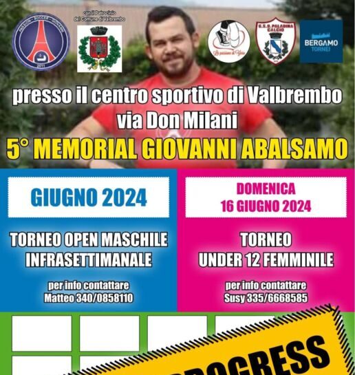 Il 4 marzo di 6 anni fa, il vuoto lasciato tra gli amici e i colleghi di Bergamo & Sport. Noi. Il suo paese, appena 6 giorni più tardi, gli dedicò i campi a 5 della struttura sportiva comunale. Ora è tutto pronto per la quinta edizione del Memorial Giovanni Abalsamo, dedicato al giovane padre di famiglia di Valbrembo tragicamente sconfitto dal male e strappato agli affetti più cari alla prematura età di soli 37 anni. Ma da qui a giugno le caselle da riempire sono quelle delle contendenti.