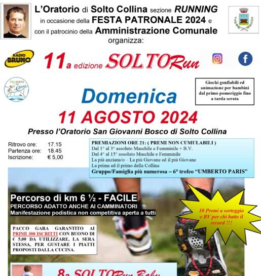 propone per domenica 11 agosto 2024 alle ore 18,45 (sempre la seconda domenica di agosto) alla 11ª edizione della “SOLTORUN”, manifestazione podistica non competitiva aperta a tutti, percorso facile di km 6,5 attraverso il paese di Solto ed Esmate adatto a Podisti, intere Famiglie e Camminatori…al termine servizio doccia, cena presso la festa Patronale di Santa Maria Assunta (sconto di euro 5,00 a persona per chi è iscritto) e gonfiabili a diposizione per tutti i bambini.