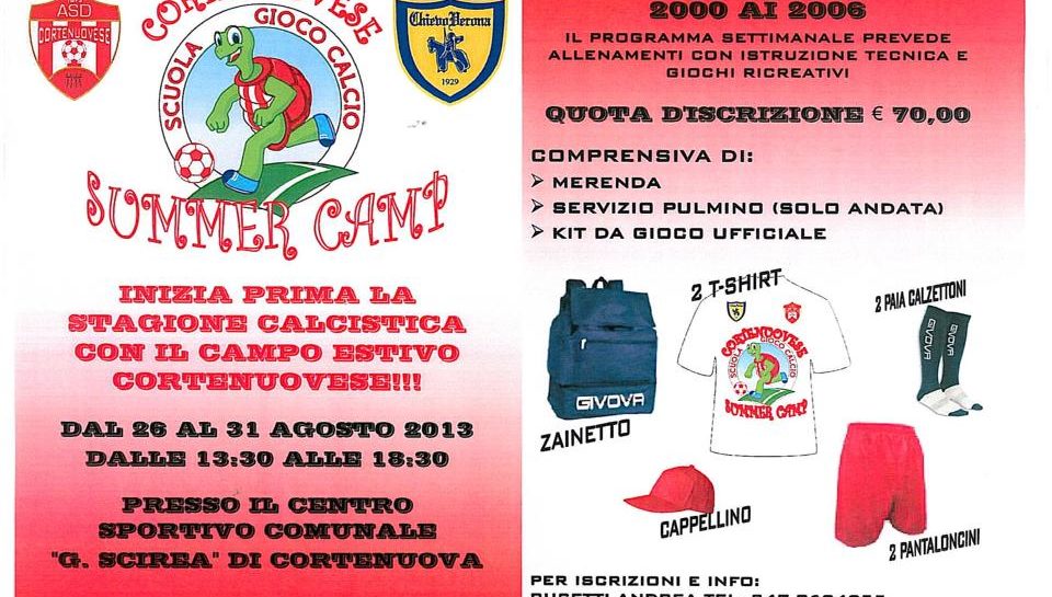 – Un summer camp a Cortenuova. No, non si tratta di una notizia destinata ad evaporare sotto l’ombrellone. La società biancorossa ha infatti confermato l’evento (prima volta nella sua storia), che si terrà presso il Centro sportivo comunale “Gaetano Scirea” nei pomeriggi dal 26 al 31 agosto 2013. Potranno partecipare alla manifestazione tutti i ragazzi delle annate comprese tra il 2000 e il 2006, con un programma settimanale che alternerà allenamenti tecnico-tattici di calcio a giochi ricreativi. La quota d’iscrizione sarà dell’importo di 70 euro e comprenderà: merenda, servizio pulmino di sola andata e kit da gioco ufficiale (zainetto, 2 t-shirt, 2 paia calzettoni, 2 pantaloncini e cappellino). Per iscrizioni e informazioni varie è possibile contattare il signor Andrea Busetti: telefono 347-8694955, mail and.buse@libero.it.
