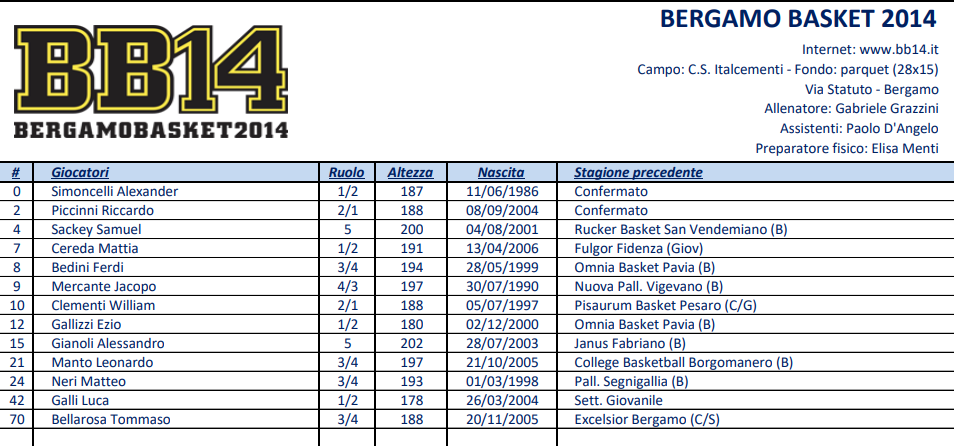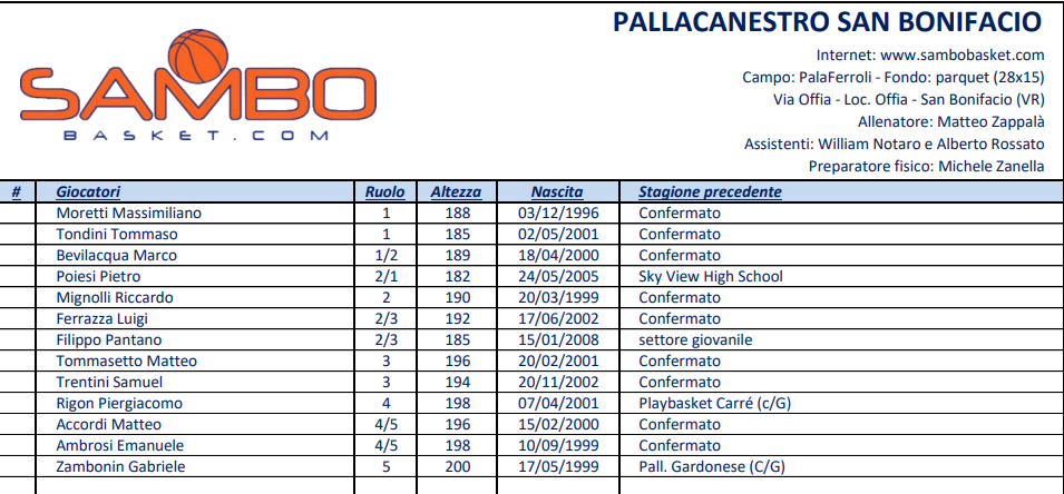 Una piazza entusiasta anche per aver conservato il nocciolo duro della scalata delle categorie. Elementi ad altissima fedeltà come il capitano Marco Bevilacqua, il 4-5 Emanuele “Manu in pasta” Ambrosi in società fin dal minibasket, o il pari ruolo Accordi, detto il Colosso di Affi, presente fin dal 2018, passando per il “Rosso di Valpolicella” Mignolli in maglia orange da un settennio. Il bolzanino Trentini è alla seconda annata come il friulano Moretti, quarta per Tommasetto, il Fromboliere di Cologna Veneta, mentre l’ala Ferrazza alias l’Airone di Pescantina è un innesto risalente alla metà della scorsa stagione. C’è la curiosità di Poiesi, dritto da una high school dello Utah ma in prestito dalla XXL Pescantina; tra i saluti estivi, quello di di Filippo Bertoni, in doppio tesseramento con la Scaligera Verona e adesso a Vigevano.