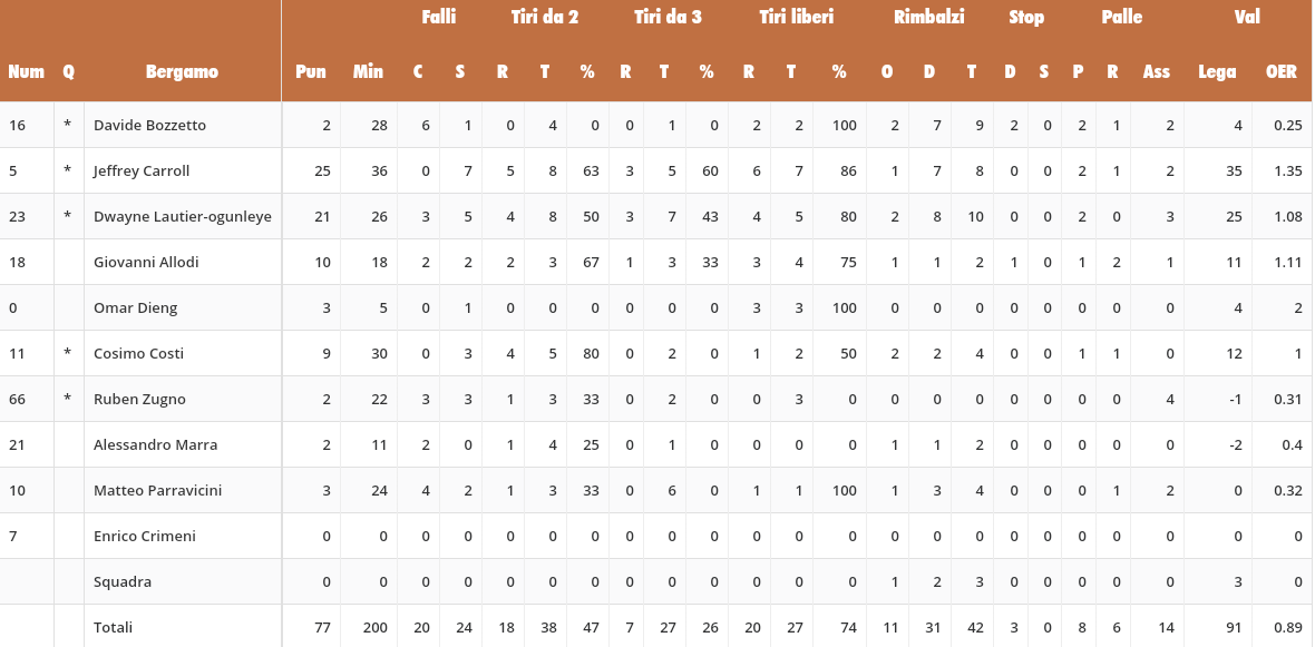Se Jeffrey Carroll fa le pentole (18 nella sola prima metà, 25 totali) e Dwayne Lautier-Ogunleye da doppia cifra anche nei rimbalzi ci mette i coperchi, il motore della Bergamo Basket va a pieni giri e l’Eurobasket Roma può essere cucinata. Agli ordini della triade Ferretti-Pazzaglia-Chersicla, davanti a 793 spettatori, partono Zugno, Lautier-Ogunleye, Carroll, Costi e Bozzetto contro Miles, Viglianisi, Loschi, l’ex Fattori e Taylor. Visto che i lunghi sono poco serviti sembra una questione tra piccoli, con Miles pericolo pubblico numero uno tra i capitolini che in questo campionato giocano in casa a Cisterna di Latina.