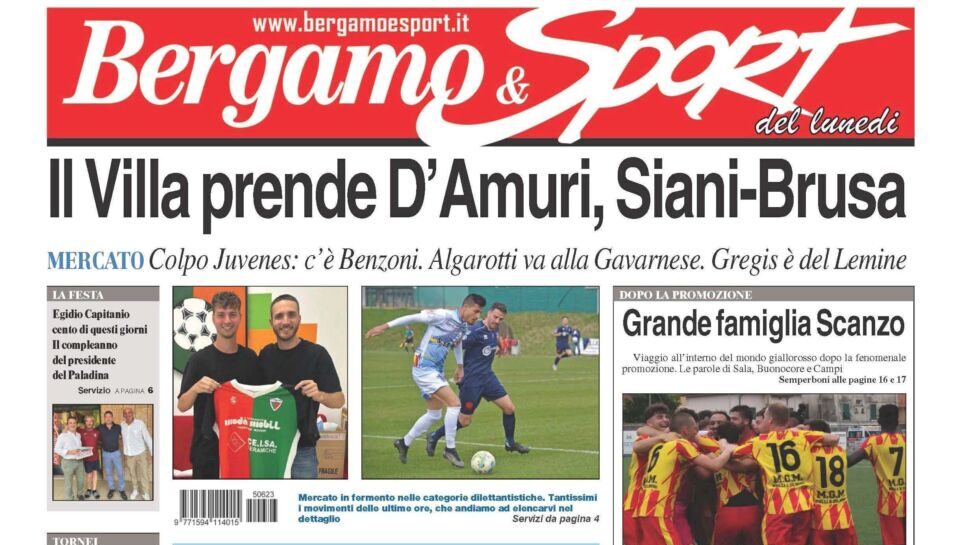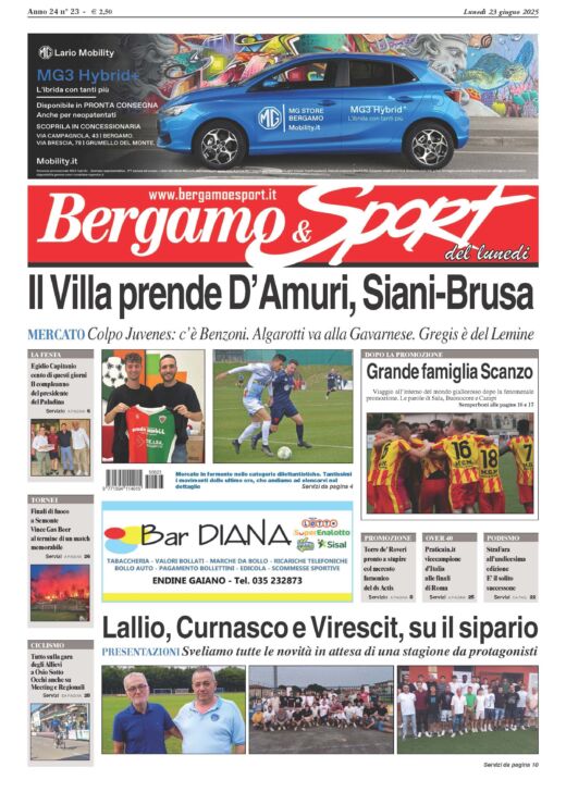 Bergamo & Sport torna in edicola con un numero ricchissimo. Le ultime sul mercato dell’Atalanta, affinità e differenze tra Juric e Gasp nell’analisi di Daniele Mayer. Celebriamo la promozione dello Scanzo con una doppia pagina speciale e le interviste ai protagonisti della cavalcata giallorossa. Tanto mercato dilettanti con i colpi in Serie D, Eccellenza, Promozione e Prima. Arrivano le prime presentazioni: alziamo il sipario su Lallio, Curnasco e Virescit. Ancora tanto calcio dilettanti con gli approfondimenti su Torre de’ Roveri, Sovere, Fara, Leffe, Gandinese, Nembrese, Orio Pegu, Aurora Terno, Grassobbio, San Tomaso, Villa d’Adda, Tavernola, Berbenno, Tribulina, Sabbio, Boccaleone, Virtus Gazzaniga, Bottanuco, Sorisolese e Suisio. Festeggiamo poi il compleanno di Egidio Capitanio, mitico presidente del Paladina e celebriamo l’addio al calcio di Marco Brevi, icona del Tribulina. Andiamo alla scoperta di uno dei settori giovanili più rinomati della nostra provincia, quello della Lemine Almenno. Mister Gamba, fresco di nomina all’Oratorio Brusaporto, ripercorre con noi la sua carriera. Focus, sui tornei, col Bena, le finali di Semonte e quello di Torre Boldone. Ampio spazio alle finali nazionali Over 40, in cui i bergamaschi della Praticain.it si piazzano al secondo posto. E poi il Premio Uomo di Sport a Beppe Bergomi, il podismo con l’undicesima edizione della StraFara, e tanto ciclismo con la gara di Osio Sotto, i regionali Allievi e il Meeting dei Giovanissimi.