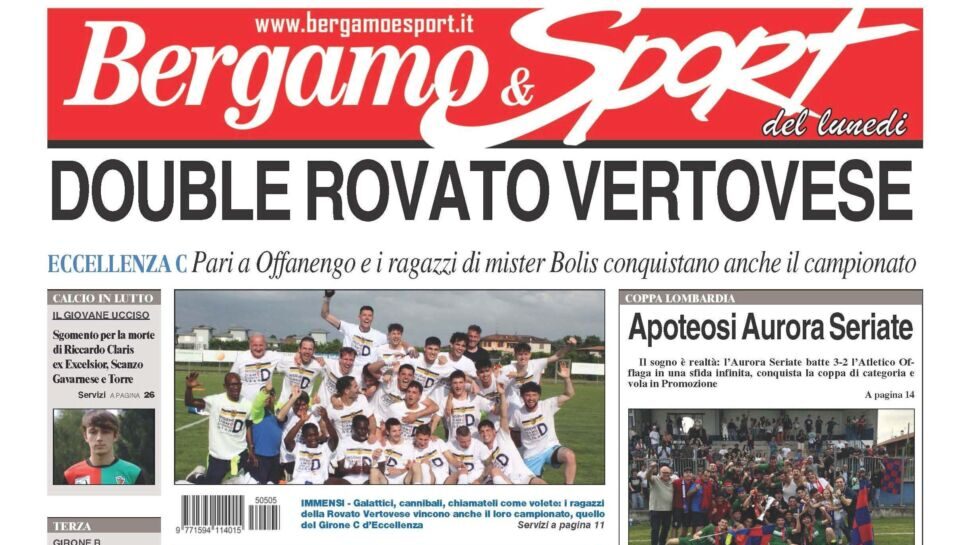 In una delle giornate più tristi per la nostra provincia per via della morte di Riccardo Claris, 26 anni, ex calciatore di sei squadre dilettantistiche, accoltellato nella notte tra sabato e domenica nella zona dello stadio, Bergamo & Sport torna in edicola raccontandovi tutto sulla domenica sportiva nella nostra provincia. In evidenza sul nostro settimanale, pubblicazione che potete acquistare o dal vostro giornalaio di fiducia o tramite la nostra edicola digitale cliccando dalle sei di mattina su www.bergamoesport.it/abbonamenti, le formazioni che hanno fatto il grande salto di categoria. Applausi, quindi, ai cannibali della Rovato Vertovese (Eccellenza C), in trionfo dopo aver vinto il loro girone. Per i galattici di Bolis, che hanno conquistato anche la Coppa Italia Regionale, sabato a Teramo ci sarà la finalissima nazionale dell’importantissimo trofeo. Avversario il Barletta e l’intera Val Seriana sogna di raggiungere lo storico traguardo. Festeggia l’Aurora Seriate (Prima E), da ieri in Promozione in virtù del successo in Coppa Lombardia ai danni dell’Atletico Offlaga, così come la domenica è dolcissima per la Libertas Casiratese (Seconda I) e per il San Tomaso (Terza B), rispettivamente saliti in Prima e in Seconda dopo gli entusiasmanti spareggi promozione contro la Pianenghese e l’Ares Redona. Giornale ricchissimo di notizie, si va dall’Atalanta, poker in casa del Monza, alle ultime sfide in Serie D e in Eccellenza, passando dai play-out di Seconda e ai play-off di Terza. Molto calcio giovanile, abbiamo seguito per voi le semifinali provinciali Juniores, le finalissime della Coppa Lombardia Juniores, la Super Coppa Cassera, il Torneo Cassera, il Torneo Ciatto e il Torneo Mazzoleni e Partners. Non può mancare il ciclismo, con i nostri giornalisti che raccontano le splendide corse dei giovani atleti bergamaschi a Bagnatica e a Comenduno di Albino. Questo e altro, da leggere d’un fiato i nostri primo piano sulla Stracurno e sulla Maratona della Valle Seriana, su Bergamo & Sport. Concludiamo con il consueto augurio ai nostri lettori di una buona settimana, da iniziare seguendo il solito consiglio: non importa dove, non importa come e non importa quando, ma comperate Bergamo & Sport!!!