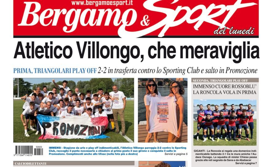Bergamo & Sport torna in edicola raccontandovi tutto sul fine settimana sportivo nella nostra provincia. In evidenza sul nostro settimanale, pubblicazione che potete acquistare o dal vostro giornalaio di fiducia o tramite la nostra edicola digitale cliccando dalle sei di mattina su www.bergamoesport.it/abbonamenti, un Atletico Villongo da sogno. Fantastici i ragazzi di mister Belotti che pareggiano 2-2 con lo Sporting Club, conquistano il primo posto del loro girone play-off e salgono in Promozione. Salto di categoria anche per la super Roncola, in Prima dopo il successo contro l’Audace Osnago. Complimenti, ovviamente, a entrambe le rose, agli staff tecnici, agli allenatori, ai presidenti e ai dirigenti delle due società. Sperano invece nei ripescaggi, e le possibilità sono parecchie, Carobbio e Farese, che hanno chiuso i rispettivi triangolari play off di Seconda centrando la piazza d’onore e pure loro sono ormai prossimi all’approdo in Prima. Nella partita d’andata della finalissima nazionale d’Eccellenza lo Scanzo impatta col Riva Samba e per i giallorossi l’appuntamento con la Serie D sarà tra sette giorni in Liguria. In questo numero tantissimo calciomercato dilettanti, poi i nostri approfondimenti, da segnalare gli articoli sulla nascita a Loreto del Bergamo Calcio, poi i servizi sul Pumenengo, sull’Atalanta, sulla Coppa Valbrembana, sul Torneo Amec, sul Trofeo di Borgo Palazzo, sul Trofeo Ruggeri, sul Torneo Freti, sull’Adri Cup, sul Torneo Cossetti, sul Gran Galà del Calcio Bergamasco, sulla camminata non competitiva di Comun Nuovo e sul Tennis Vip. Da conservare il calendario della Serie A realizzato dai nostri grafici che trovate in una meravigliosa doppia pagina a colori. Moltissime le pagine di ciclismo con i nostri inviati che nel fine settimana sono andati a Brembilla, a Casazza e a Sorisole. Tutto questo e molto di più… E a noi non resta che salutare i nostri lettori col consueto augurio di una buona settimana, da iniziare seguendo il solito consiglio: non importa dove, non importa come e non importa quando, ma comperate Bergamo & Sport!!!