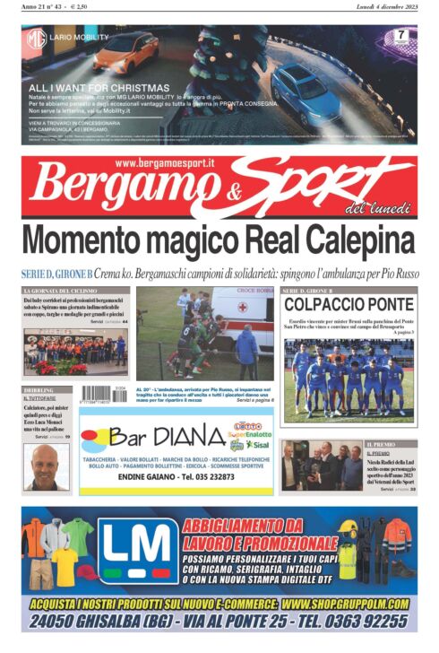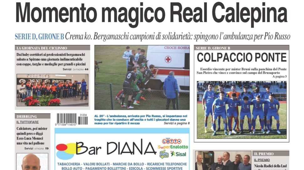 Continua l’ottimo momento della Real Calepina che batte anche il Crema e a cui dedichiamo il titolo di apertura di questo numero di Bergamo & Sport, che, come sempre, potete acquistare o dal vostro giornalaio di fiducia o tramite la nostra edicola digitale cliccando dalle sei di mattina su www.bergamoesport.it/abbonamenti. Ragazzi di mister Capelli in gran forma e protagonisti di un bel gesto di solidarietà successo al 20° del primo tempo, pronti a fermare la partita per spingere tutti insieme l’ambulanza arrivata in soccorso dell’attaccante ospite Pio Russo e che si era impantanata nel tragitto per uscire dall’impianto sportivo. Non solo la formazione di Grumello, in primo piano anche il Ponte San Pietro che espugna Brusaporto dopo il cambio in panchina (complimenti al tecnico Bruni) grazie a una doppietta del sorprendente Gningue (stellare).