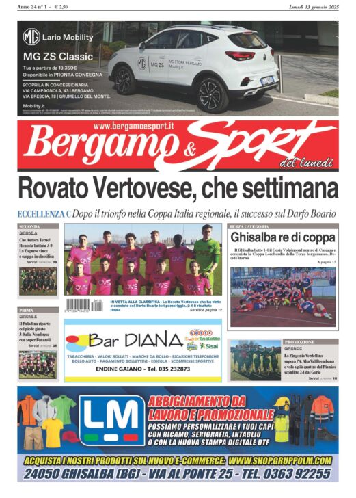 lunedì 13 Gennaio 2025Bg & Sport in edicola: in evidenza la Rovato Vertovese, il Ghisalba, lo Zingonia Verdellino, il Paladina e l’Aurora Terno