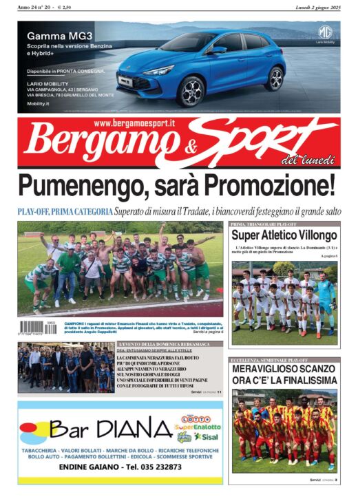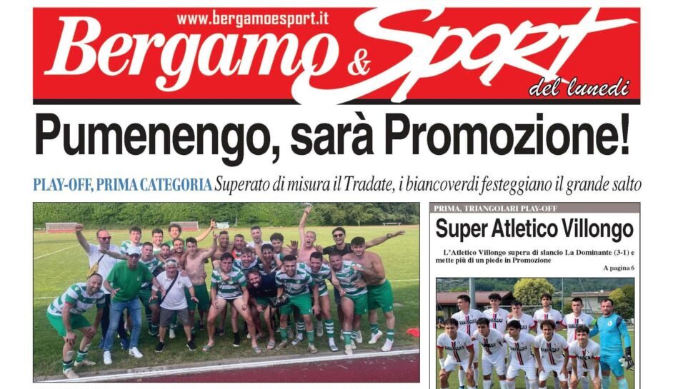 Bergamo & Sport torna in edicola raccontandovi tutto sul fine settimana sportivo nella nostra provincia. In evidenza sul nostro settimanale, pubblicazione che potete acquistare o dal vostro giornalaio di fiducia o tramite la nostra edicola digitale cliccando dalle sei di mattina su www.bergamoesport.it/abbonamenti, il Team Oratorio Pumenengo, grande realtà calcistica che in questa domenica ha strappato il pass per il prossimo campionato di Promozione vincendo sul campo di Tradate. Bravi, bravissimi, e applausi, ovviamente, ai giocatori in rosa, allo staff tecnico, a mister Finazzi, al ds Finetti, al presidente Cappelletti e a tutti i dirigenti. Restando in tema play-off, passi avanti fondamentali sia dello Scanzo, ora atteso all’ultimo atto di una stagione fantastica che potrebbe portare i giallorossi in Serie D, e all’Atletico Villongo, sontuoso nel primo match dei triangolari play-off di Prima Categoria. Sfide promozione in primo piano con i nostri collaboratori sui campi della nostra regione, poi il calciomercato dilettanti, mai così nel vivo, quindi gli Over 40, il Tennis Vip, la Camminata Nerazzurra, con un imperdibile speciale di venti pagine, infine i moltissimi tornei di pallone e il ciclismo giovanile con la cronaca e le foto dei nostri ragazzi in gara sulle strade di Villongo. Sipario alzato sugli eventi seguiti, la Coppa Valbrembana, il Torneo di Borgo Palazzo, il Memorial Freti, il Torneo Ottica Moderna, l’Adry Cup, il Torneo di Pagazzano, il Memorial Mazza e il Provincial Parade. Questo e moltissimo altro sul numero odierno di Bergamo & Sport. E noi concludiamo la nostra breve presentazione con il consueto augurio ai nostri lettori di una buona settimana, da iniziare seguendo il solito consiglio: non importa dove, non importa come e non importa quando, ma comperate Bergamo & Sport!!!
