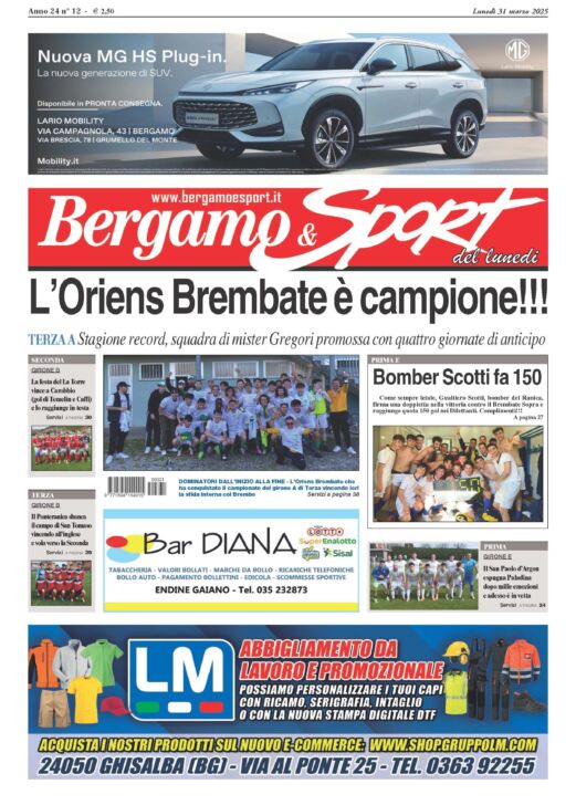 Celebriamo i primi campioni della stagione calcistica 2024-2025! Dopo un’annata a dir poco fantastica, i ragazzi dell’Oriens Brembate battono il Brembo e conquistano il Girone A di Terza Categoria salendo in Seconda. A loro è dedicata la prima pagina di Bergamo & Sport, il settimanale dei calciatori della nostra provincia, pubblicazione che potete acquistare o dal vostro giornalaio di fiducia o tramite la nostra edicola digitale cliccando dalle sei di mattina su www.bergamoesport.it/abbonamenti. Tanti i temi caldi in questa domenica di fine marzo. Iniziamo: salgono a dismisura le quotazioni di San Paolo d’Argon (Prima E), La Torre (Seconda B) e Ponteranica (Terza B) di conquistare i rispettivi campionati dopo le vittorie nei big match di giornata. Poi, in evidenza, Gualtiero Scotti, bomber letale (e ragazzo dalla simpatia contagiosa), arrivato a quota 150 gol nei dilettanti dopo la decisiva doppietta che ha portato il suo Ranica (Prima E) a vincere l’importante sfida col Brembate Sopra. Complimenti! Molte le partite seguite, moltissimi gli approfondimenti, su tutti quelli sulle camminate record andate in scena domenica mattina a Ponte e a Urgnano. Questo e altro sul nostro settimanale e noi ci congediamo col solito consiglio: non importa dove, non importa come e non importa quando, ma comperate Bergamo & Sport.