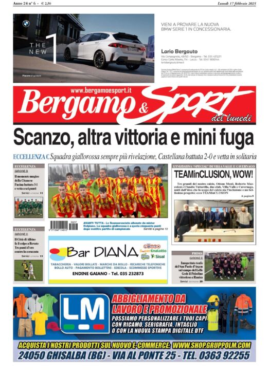 lunedì 17 Febbraio 2025Bg & Sport in edicola: in primo piano lo Scanzo, il TEAMinCLUSION, il Città di Albino, la Cisanese, il Paladina e il Leffe