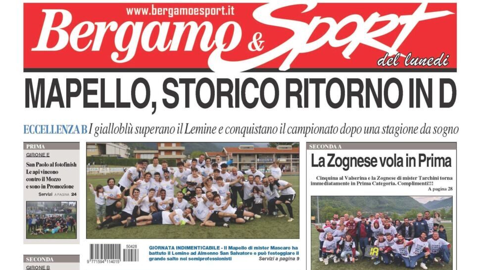 Il Mapello è in Serie D. Reduci da una stagione straordinaria, i ragazzi di Mascaro vincono anche in casa del Lemine e conquistano il campionato del Girone B di Eccellenza e il salto tra i semiprofessionisti. Applausi, quindi, ai gialloblù, allo staff, alla rosa, al presidente Arrigoni e a tutti i suoi dirigenti, oggi in primo piano su Bergamo & Sport, il settimanale dei calciatori della nostra provincia, pubblicazione che potete acquistare o dal vostro giornalaio di fiducia o tramite la nostra edicola digitale cliccando dalle sei di mattina su www.bergamoesport.it/abbonamenti. Vince il difficilissimo Girone E di Prima il San Paolo che batte il Mozzo e supera sul fotofinish il Paladina, ko a Brembate Sopra, dopo un duello che rimarrà per molto tempo nei ricordi degli appassionati di calcio bergamasco. Complimenti alle api di mister De Martini, così come il nostro settimanale festeggia le imprese promozione della galattica Zognese (Seconda A) del mago Tarchini, del super Atletico Grignano (Seconda C) di Bonetti e del mai domo e spettacolare La Torre (Seconda B) di Bonassi, formazioni che da oggi sono tutte in Prima. Tantissime le cronache nella giornata dei verdetti in Promozione, Prima, Seconda e Terza e non possiamo non segnalare il trionfo della Rovato Vertovese (Eccellenza C) nel match d’alta quota contro gli eterni rivali dello Scanzo. Poi gli approfondimenti, le camminate, ieri quella di Mariano di Dalmine, e il ciclismo giovanile con le gare di Villa d’Almé. Che altro dire? Il consueto augurio ai nostri lettori di una buona settimana, da iniziare seguendo il solito consiglio: non importa dove, non importa come e non importa quando, ma comperate Bergamo & Sport!!!