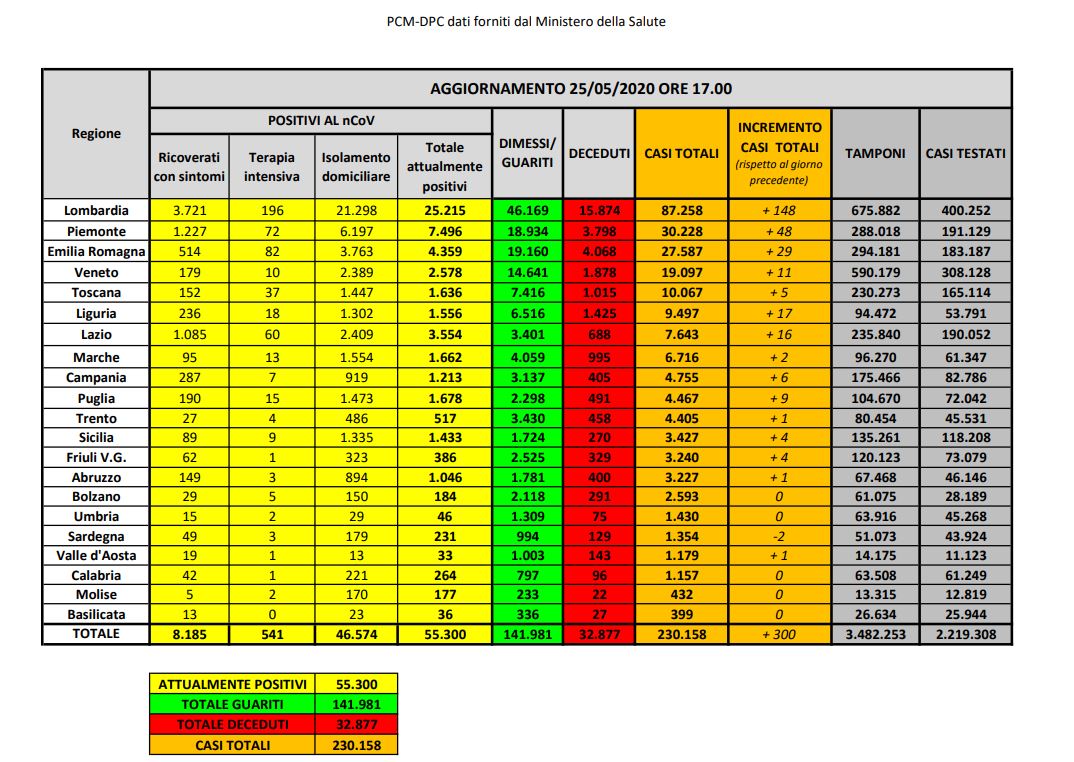 Bollettino nazionale del 25 maggio, il totale delle persone attualmente positive ammonta a quota 55300 (-1294 rispetto a domenica). Dall’inizio dell’epidemia sono 230158 le persone colpite da Covid-19 in Italia. I nuovi casi registrati nelle ultime 24 ore sono 300 a fronte di 35.241 tamponi processati (ieri i nuovi casi erano 531 a fronte di 55.824 tamponi processati). I decessi registrati nelle ultime 24 ore sono 92 (32.877 il totale). Si registrano inoltre 1.502 pazienti guariti (141.981 il totale). Calano le terapie intensive (si passa da 553 a 541, -12) e i ricoveri non in terapia intensiva (si passa da 8.613 a 8.185, -428). Le persone sottoposte a tampone dall’inizio dell’epidemia sono 2.198.632.