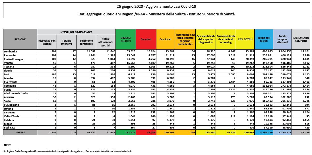 Bollettino nazionale del 26 giugno, sono 259 i nuovi casi riscontrati nelle ultime 24 ore sul territorio italiano. I decessi registrati nell’ultima giornata sono 30 (34708 il totale), i guariti 890 (187615 il totale). Le persone attualmente positive sono 17638: di questi, 16177 si trovano in isolamento domiciliare, senza sintomi o con sintomi lievi. 1356 sono gli ospedalizzati con sintomi e 105 le persone in terapia intensiva.