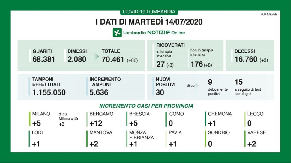 Bollettino regionale del 14 luglio, i nuovi casi registrati in Lombardia nelle ultime 24 ore sono 30 a fronte di 5.536 tamponi processati. Dei 30 casi positivi di oggi, 9 evidenziano una positività ‘debole’ e 15 sono stati individuati a seguito dei test sierologici. Sono 3 i decessi registrati nelle ultime 24 ore sul territorio regionale, mentre i guariti e i dimessi sono 86. Calano dei pazienti ricoverati in terapia intensiva (-3), ulteriore aumento dei ricoverati con sintomi (+8). In provincia di Bergamo si registrano 12 nuovi casi certificati.