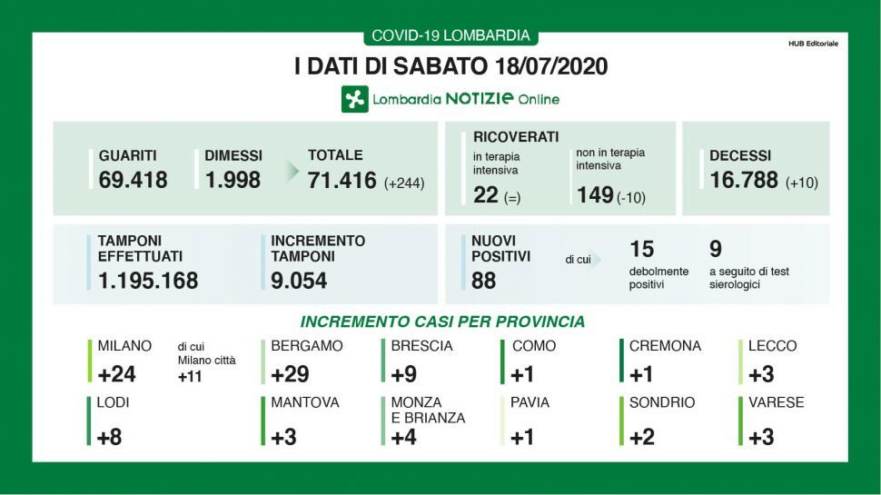 Bollettino regionale del 18 luglio, i nuovi casi registrati in Lombardia nelle ultime 24 ore sono 88 a fronte di 9.054 tamponi processati. Degli 88 casi positivi di oggi, 15 evidenziano una positività ‘debole’ e 9 sono stati individuati a seguito dei test sierologici. Sono 10 i decessi registrati nelle ultime 24 ore sul territorio regionale, mentre i guariti e i dimessi sono 244. Stabili i pazienti ricoverati in terapia intensiva, calano i ricoverati con sintomi (-10). In provincia di Bergamo si registrano 29 nuovi casi certificati.