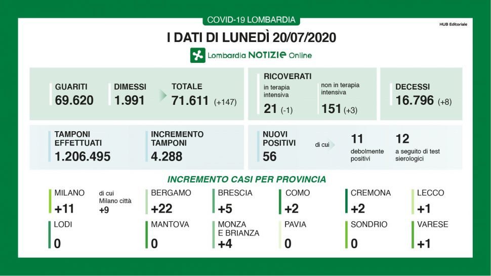 Bollettino regionale del 20 luglio, i nuovi casi registrati in Lombardia nelle ultime 24 ore sono 56 a fronte di 4.288 tamponi processati. Dei 56 casi positivi di oggi, 11 evidenziano una positività ‘debole’ e 12 sono stati individuati a seguito dei test sierologici. I decessi registrati nelle ultime 24 ore sul territorio regionale sono 8, mentre i guariti e i dimessi sono 147. Leggero calo dei pazienti ricoverati in terapia intensiva (-1), leggero aumento dei ricoverati con sintomi (+3). In provincia di Bergamo si registrano 22 nuovi casi certificati.
