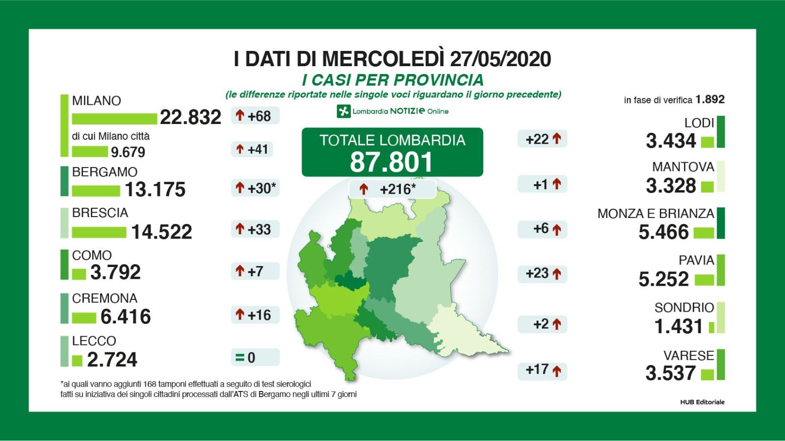 Bollettino regionale del 27 maggio, i nuovi casi registrati nelle ultime 24 ore sono 384, a fronte di 12.503 tamponi processati. Risale il rapporto nuovi casi/tamponi processati: ora supera il 3% (ieri era all’1.7%). Regione Lombardia, nell’infografica autoprodotta, evidenzia comunque un rapporto costante all’1.7% perché non considera i tamponi positivi effettuati a seguito di test sierologici (e sinceramente non se ne capisce il motivo). I nuovi decessi sono 58. Calano i ricoveri in terapia intensiva (-8), leggero aumento di ricoverati con sintomi (+4). I nuovi guariti e dimessi sono 766. In Bergamasca i nuovi casi registrati sono 198 (168 frutto di tamponi positivi processati a seguito di test sierologici fatti su iniziative di singoli cittadini e processati dall’ATS di Bergamo negli ultimi 7 giorni). Di seguito tutti i dati e le infografiche di Regione Lombardia.