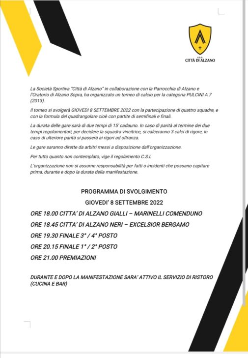 Si gioca al meglio di due tempi da un quarto d’ora ciascuno con regole CSI (e non in tre mini-set come la FIGC); in caso di parità, una serie di 3 tiri di rigore ciascuno e se necessario a oltranza. Alle sette e mezza la finalina, alle otto un quarto la finalissima. Nello spirito del più genuino calcio oratoriale, attivo il servizio bar e ristorazione. I gialloneri di Alzano Lombardo sono reduci dal collegiale sempre sul campo dell’Immacolata insieme all’Accademia Val San Martino nello scorso weekend, organizzato dalla new entry societaria Maurizio Mangili (che nel torneo di cui sopra ha ), ex Azzano FG e dirigente storico dei verdi di Alzano Maggiore, con 59 partecipanti tra atleti (classi 2007, 2009, 2010 e 2011) e staff. Per adesso, comunque, niente fusione per dar vita alla prima squadra: Immacolata (culla dei due Madonna e Luca Percassi) e AlzaNese a livello senior restano entità indipendenti. Un domani, invece, chissà.