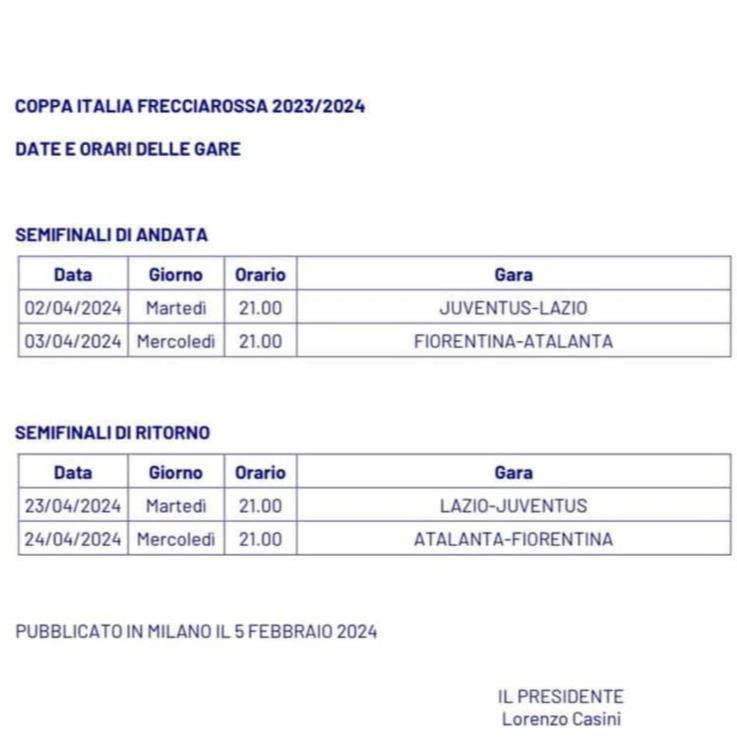 lunedì 5 Febbraio 2024Coppa Italia, date e orari: con la Fiorentina di mercoledì (in aprile)