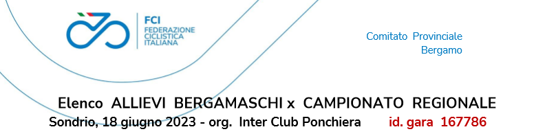 Il Comitato Provinciale di Bergamo della Federazione Ciclistica Italiana rende noto l’elenco degli atleti bergamaschi della categoria Allievi convocati per prendere parte domenica 18 giugno a Sondrio al Campionato Regionale Lombardo Strada di categoria. XXIII° Trofeo Inter Club Ponchiera di 77 chilometri con partenza alle 9:30 e arrivo previsto intorno alle 11:45. Ritrovo dalle 7:30 in Piazza Garibaldi a Sondrio.