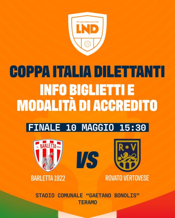 Si riportano, di seguito, le disposizioni relative alle procedure di acquisto dei biglietti e le modalità di accredito per la gara in oggetto, BARLETTA 1922-ROVATO VERTOVESE, in programma sabato 10 maggio 2025, alle ore 15.30, presso lo Stadio Comunale “Gaetano Bonolis” di Teramo – Località Piano d’Accio.