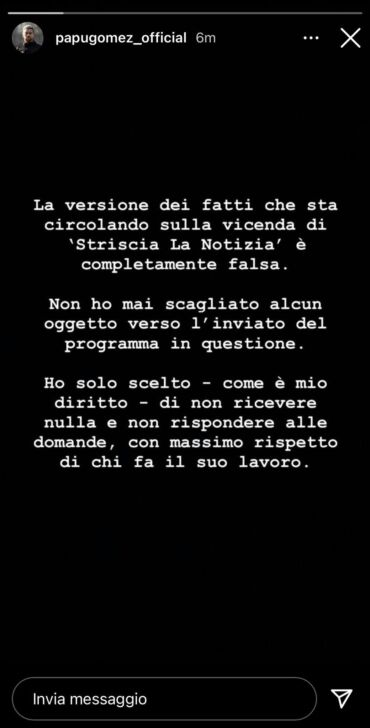 Ecco la smentita. Via Instagram, come ormai è suo costume. Alejandro Gomez detto Papu non ci sta a passare per il cattivo di turno e respinge in toto la notizia apparsa tra le altre testate sull’edizione web di SportMediaset che l’accusa di aver scagliato il Tapiro d’Oro contro la troupe di Valerio Staffelli. “La versione dei fatti che sta circolando sulla vicenda di ‘Striscia la Notizia’ è completamente falsa – si legge -. Non ho mai scagliato alcun oggetto verso l’inviato del programma in questione”. Infine, la rivendicazione del rifiuto alla replica: “Ho solo scelto – com’è mio diritto – di non ricevere nulla e di non rispondere alle domande, con massimo rispetto di chi fa il suo lavoro”.