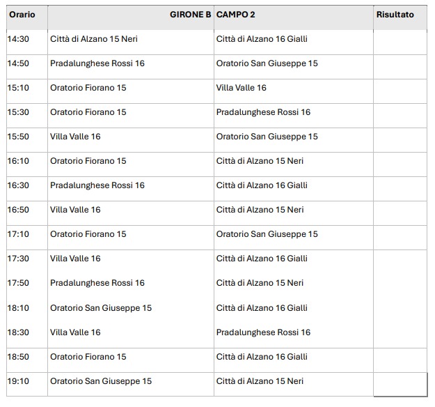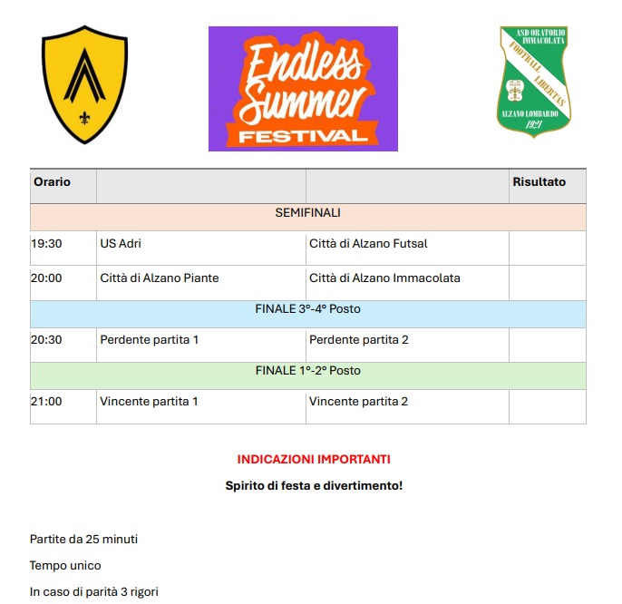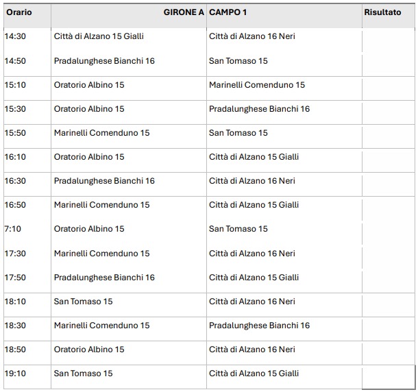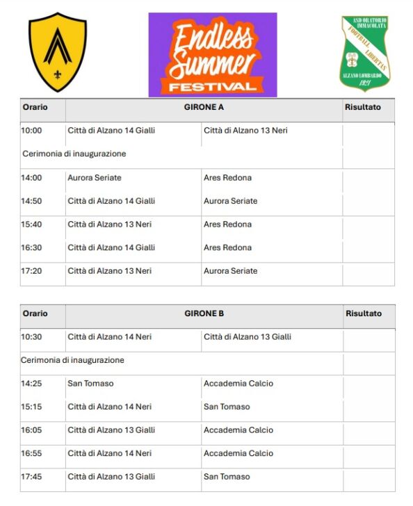 Il giorno di festa, infine, è dedicato agli Esordienti delle annate 2013 e 2014. Nel primo raggruppamento, dalle 10 in avanti, le due Città di Alzano se la vedono con Aurora Seriate e Ares Redona. Il secondo, consumata la sfida in famiglia locale tra Gialli e Neri alle 10.30 con interruzione per la cerimonia d’inaugurazione, riprende alle 14.30 vedendo in campo anche San Tomaso e Accademia Calcio. Dalle 18, le quarte di ogni girone giocano contro le omologhe dell’altro a salire. Gli Eso giocano 9 contro 9, 20′ nel girone e 25′ nella fase finale. Il buono per pizza e bibita, ovviamente, vale anche per loro.