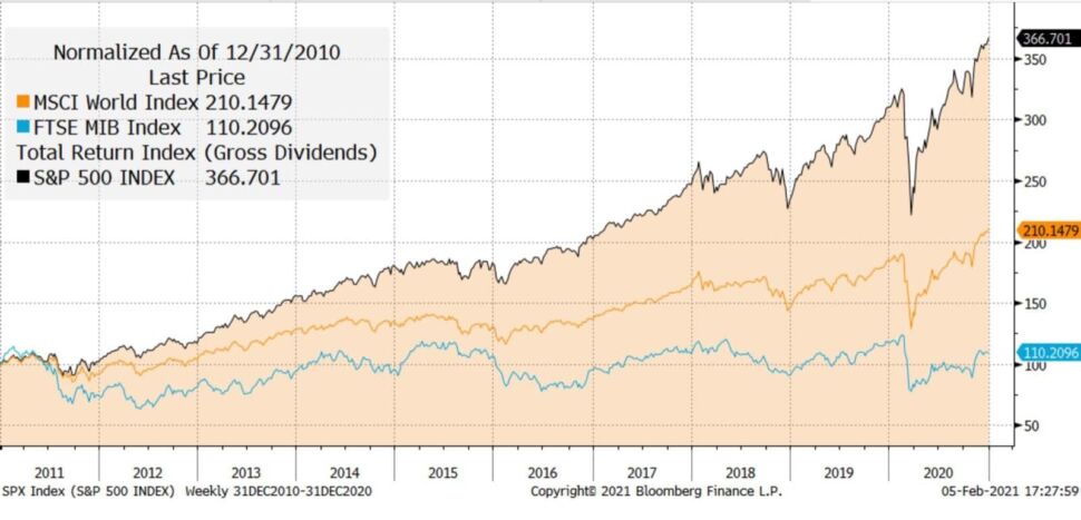 Che la Borsa italiana non sia il miglior indice dove investire ormai da molti anni sono quasi ‘stanco’ di scriverlo. Se facessimo una simulazione riguardante un investimento di 100mila euro sottoscritto nel 2009 oggi il nostro capitale sarebbe di 110mila euro circa, se lo avessimo investito sull’indice americano dello S&P500 sarebbero 366mila mentre sull’indice globale MSCI World ci ritroveremmo circa 210mila euro nel portafoglio (vedi grafico che ti allego).