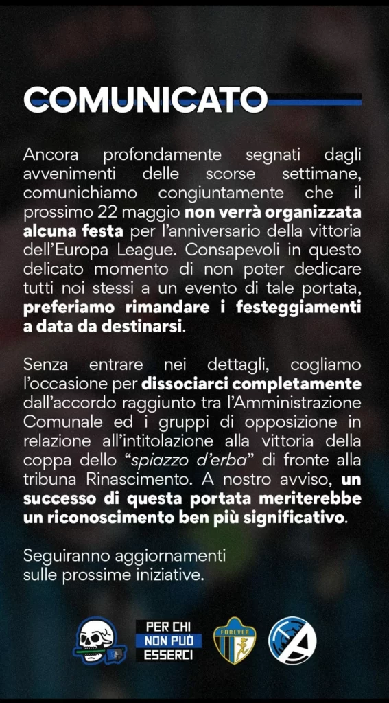 “Ancora profondamente segnati dagli avvenimenti delle scorse settimane, comunichiamo congiuntamente che il prossimo 22 maggio non verrà organizzata alcuna festa per l’anniversario della vittoria dell’Europa League. Consapevoli in questo delicato momento di non poter dedicare tutti noi stessi a un evento di tale portata, preferiamo rimandare i festeggiamenti a data da destinarsi. Senza entrare nei dettagli, cogliamo l’occasione per dissociarci completamente dall’accordo raggiunto tra l’Amministrazione Comunale ed i gruppi di opposizione in relazione all’intitolazione alla vittoria della coppa dello “spiazzo d’erba” di fronte alla tribuna Rinascimento. A nostro avviso, un successo di questa portata meriterebbe un riconoscimento ben più significativo. Seguiranno aggiornamenti sulle prossime iniziative”.