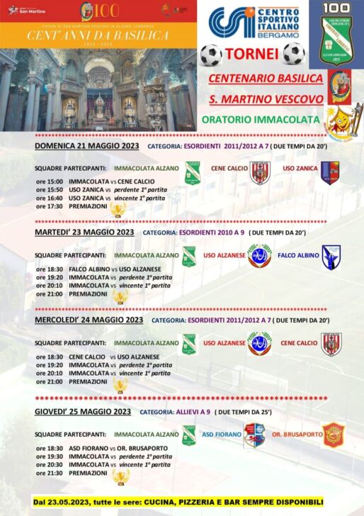 Nella terza settimana del mese corrente, ospitati ovviamente sui campi parrocchiali, i tornei per il Centenario della Basilica di San Martino Vescovo, anche se la fondazione del culto e della chiesa stessa risale addirittura a un millennio fa. Pronti, via. Domenica 21 maggio tocca agli Eso 2011-2012 a 7: due tempi da 20 minuti, alle 15 apre Immacolata-Cene, quindi l’USO Zanica affronta perdente e vincente. I più grandicelli (2010) a 9 saranno di scena, invece, martedì 23: si comincia alle 18.30 con Falco Albino-Oratori AlzaNese con l’Immacolata ad attendere l’esito della sfida. Mercoledì 24, ancora i più piccoli a 7: 18.30 Cene-Oratori AlzaNese e sempre i padroni di casa chiamati all’uno-due di sfide. Giovedì 25, infine, i due tempi da 25′ ciascuno per gli Allievi a 9: stessa formula, spareggiano per decidere chi ne fa un’altra subito dopo tra Fiorano e Brusaporto.