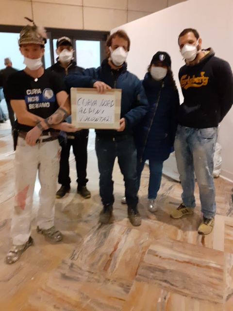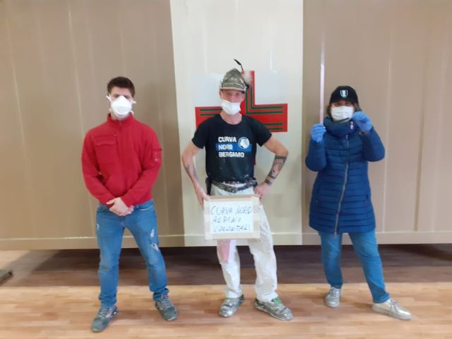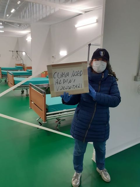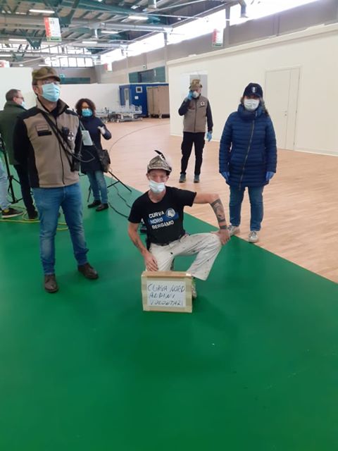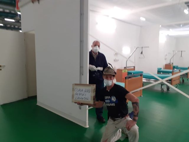 Come metto piede nell’ospedale da campo mi prende una commozione incredibile. Mi viene da piangere ma non posso farlo. Ricaccio indietro le lacrime e meravigliata osservo lo spettacolo di tutte le persone (prevalentemente artigiani bergamaschi) che stanno lavorando.