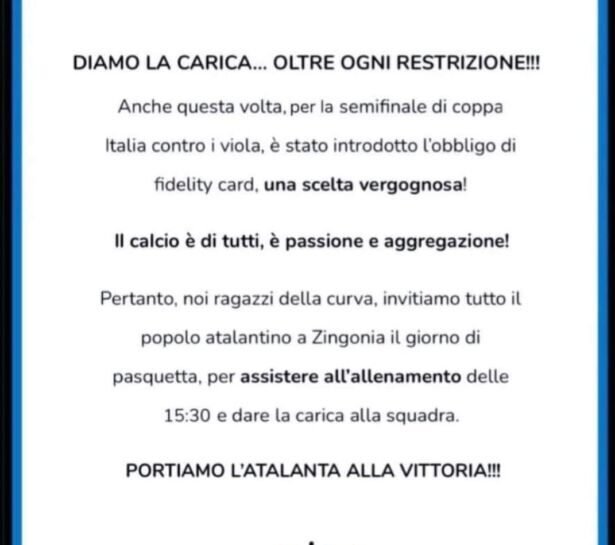 Una “scelta vergognosa” che richiede come risposta il “dare la carica” alla squadra “oltre ogni restrizione”. Il settore più caldo del tifo atalantino, da sempre contrario a schedature e restrizioni tanto da abbonarsi di volta in volta con l’ex voucher saltando le trasferte non “libere”, prende posizione una volta di più. “Noi ragazzi della Curva invitiamo tutto il popolo atalantino a Zingonia, il giorno di Pasquetta, per assistere all’allenamento delle 15.30 e dare la carica alla squadra”, si legge.