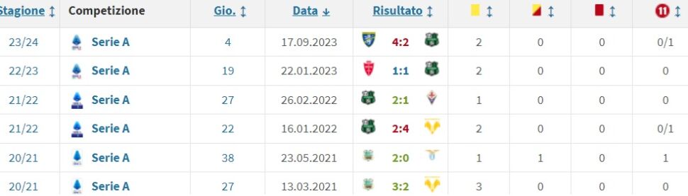 Nel ruolino di marcia, a ruota dei due successi iniziali nel 2020-2021 con Verona (3-2) e Lazio (2-0) al Mapei Stadium, il ko casalingo coi veneti (4-2), il 2-1 alla Fiorentina e il pari col Monza (vedi specchietto da Transfermarkt). Completano la squadra arbitrale gli assistenti Ciro carbone di Napoli e Alessandro Giallatini di Roma 2, il quarto ufficiale Francesco Cosso di Reggio Calabria, il V.A.R. Daniele Paterna di Teramo e l’A.V.A.R. Aleandro Di Paolo di Avezzano.