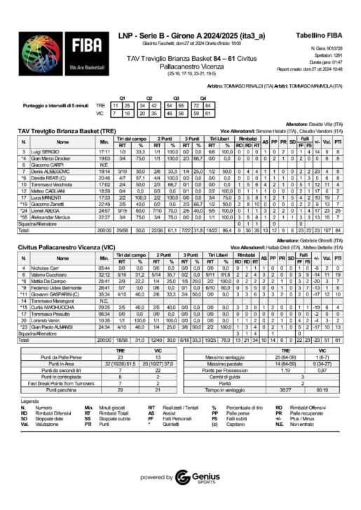 TAV Treviglio Brianza Basket: Gian Marco Drocker 8 (1/1, 2/3), Lionel Abega 25 (7/10, 2/5), Davide Reati 8 (4/4, 0/3), Giacomo Zanetti 7 (0/2, 2/3), Aleksandar Marcius 7 (3/4, 0/0); Tommaso Vecchiola 4 (2/3, 0/1), Matteo Cagliani 2 (0/3, 0/1), Giacomo Carpi NE, Denis Alibegovic 8 (2/6, 1/4), Luigi Sergio 8 (1/1, 0/2), Luca Manenti 7 (2/2, 0/0). Coach: Davide Villa.