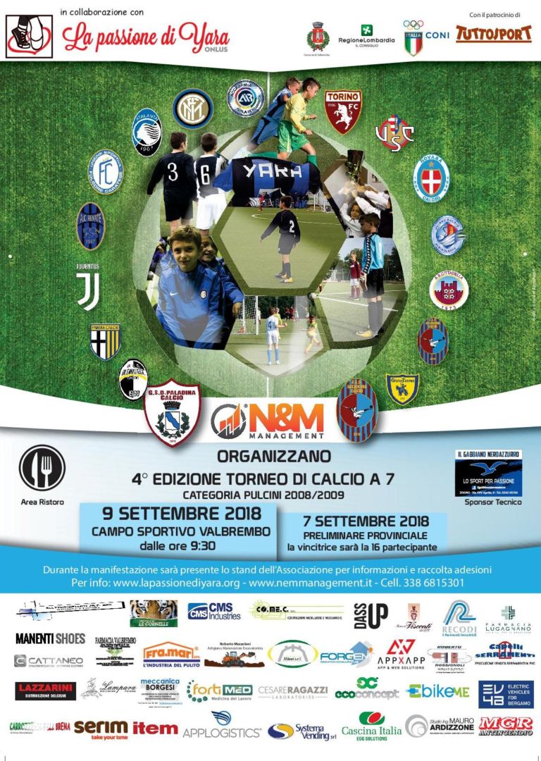 Il presidente Ivo Mazzoleni e l’intero Consiglio Direttivo dell’associazione La Passione di Yara Onlus, organizzano la conferenza stampa di presentazione del Torneo Nazionale La Passione di Yara – Categoria Pulcini, evento che si terrà a Valbrembo il prossimo 9 Settembre con la partecipazione di 16 squadre del panorama calcistico italiano e con il patrocinio del Comune di Valbrembo, di Regione Lombardia, del Coni e di Tuttosport.