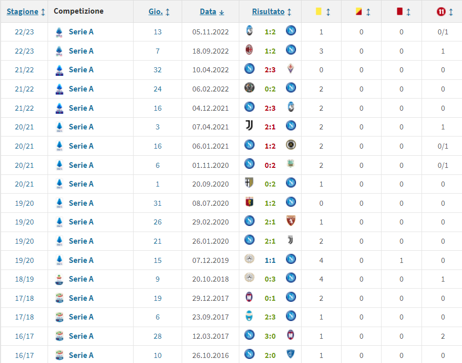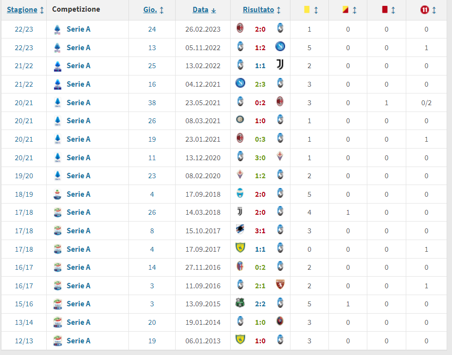Negativo il bilancio complessivo (vedi screenshot da Transfermarkt) per la squadra bergamasca, che parla di 8 sconfitte a fronte di 7 vittorie e 3 pareggi. Contro le grandi le battute d’arresto, di solito: due su tre col Milan (ultima gara arbitrata) ma anche vincendoci 3-0 a San Siro nel gennaio di due anni fa, una su una con l’Inter, una su due con la Juventus con un pareggio. Successi contro Cagliari, Torino, Bologna e Fiorentina (due), ko pure con Chievo (poi un nullo), Sampdoria e Spal.