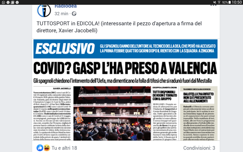 Tra ieri e oggi, e siamo soltanto al quarto giorno del post “confessioni choc”, come titolerebbero gli espertoni del click-baiting, si sono spesi nel ruolo di avvocati difensori prima l’onorevole Daniele Belotti, supertifoso dell’Atalanta, amicissimo della Curva Nord e quindi bersaglio fin troppo comodo dell’accusa di essere di parte, e quindi il giornalista Xavier Jacobelli, un altro che agli occhi di una platea di lettori-boccaloni sempre più sospettosa e gonfia d’odio ha la colpa di essere bergamasco e atalantino. Stamattina, su Tuttosport, il ribaltamento della tesi valenciana: il soldato Gasp non aveva sintomi alla vigilia della Champions né durante, gli sono venuti quattro giorni dopo esser tornato, quindi cinque dopo il retour march degli ottavi. E se quassù c’era il lockdown, laggiù c’erano le Fallas e 48 ore prima anche la Festa della Donna con centinaia di migliaia di persone in strada, senza contare i tifosi locali assiepati fuori.