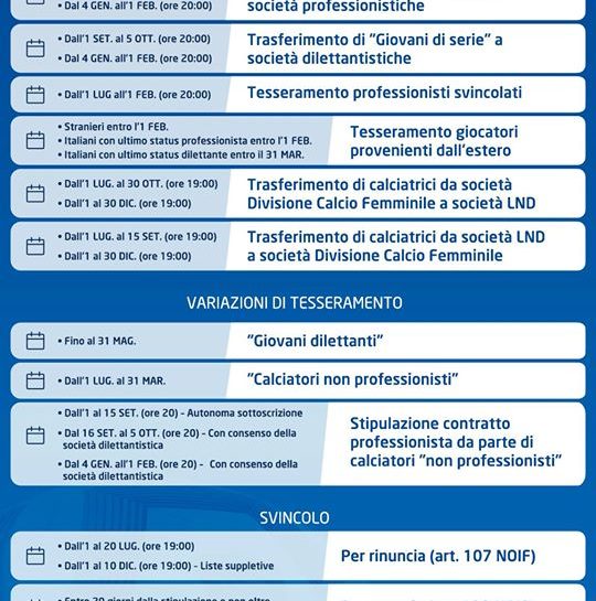 Con la pubblicazione del Comunicato Ufficiale n°328, la Lega Nazionale Dilettanti ha resoi noti tempi e modalità per l’invio delle liste di svincolo, per le variazioni di tesseramento e per i trasferimenti tra società del settore dilettantistico e fra queste e società del settore professionistico.
