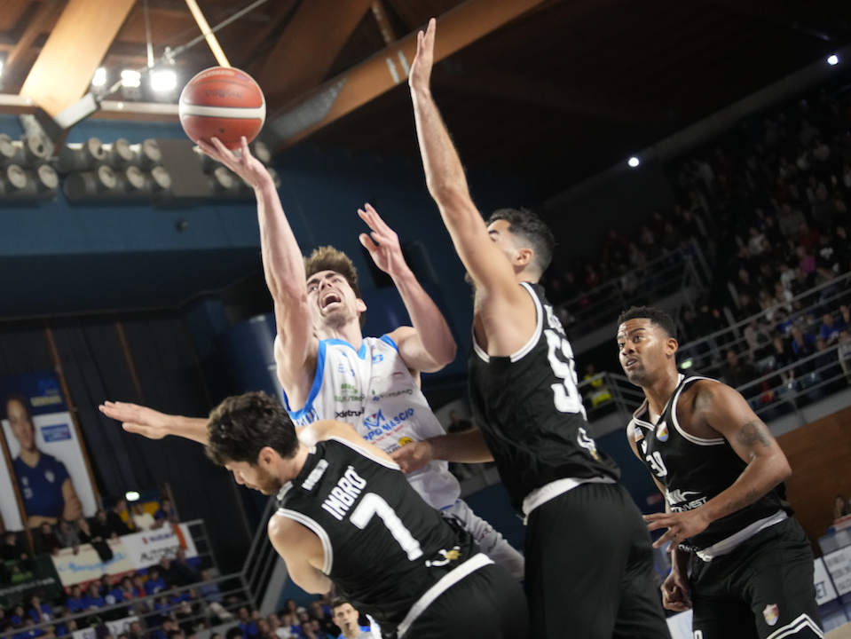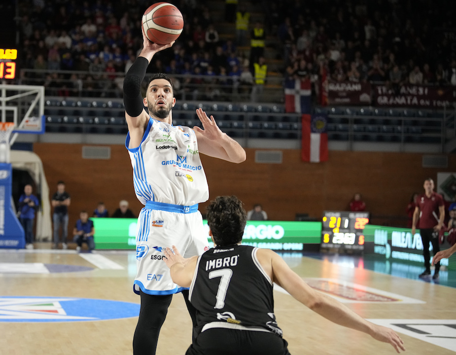 Terza frazione. La schiacciata di Mobio arriva dopo due possessi alternati senza esito su entrambi i fronti. Vitali dal fondo suggerisce per Pacher che trova anche fallo (libero non trasformato). Guariglia è lesto a riprendere un rimbalzo sulla sua conclusione ma la strada per il recupero è ancora lunga. Conclusione in allontanamento per Vitali. Tap in di Horton su tiro di Mian. Miaschi esce dopo aver commesso il quarto fallo. Va in lunetta Horton (2 su 2). Air ball di Harris per Guariglia. La difesa trevigliese di scopre e Mian la punisce con la tripla del +17. A -5’ Trapani va in bonus e Guariglia si presenta sulla linea della carità dove riscuote due punti. Vitali fa scorrere il cronometro e con un assist teleguidato serve Pacher che trova anche fallo (libero trasformato). Ancora Vitali si lancia solo in attacco, lo ferma il ferro ma sul rimbalzo trova canestro un caparbio Pacher (-10). Time out Parente. Jump di Mollura che poi si produce in una tripla. Altro assist di Vitali per Pacher e nuovo canestro e fallo (libero trasformato). La tripla di Marini vanifica tutti gli sforzi di una Treviglio per nulla doma. Tripla di Pollone. Assist di Harri per Guariglia. Pullazi dimenticato deve solo appoggiare ma arriva la tripla dal fondo di Giuri per il -9. Un tempo, soffertissimo, ma che Treviglio conquista con le unghie e con i denti dando un senso all’ultima frazione.
