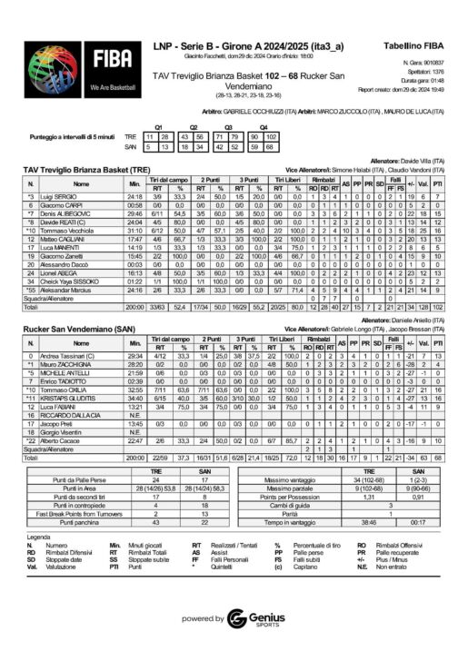 Rucker San Vendemiano: Michele Antelli (0/3, 0/3), Kristaps Gluditis 16 (3/5, 3/10), Alberto Cacace 10 (2/4, 0/2), Tommaso Oxilia 16 (7/11), Mauro Zacchigna 4 (0/2 da 3); Andrea Tassinari 13 (1/4, 3/8), Enrico Tadiotto, Giorgio Visentin N.E., Riccardo Dalla Cia N.E, Luca Fabiani 9 (3/4 da 2), Jacopo Preti (0/3 da 3). Coach: Daniele Aniello.