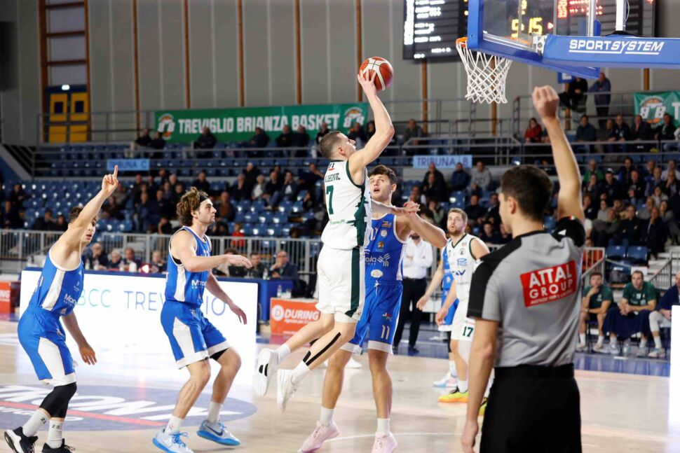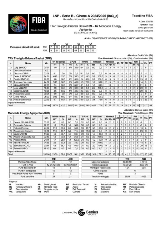 Quarta frazione. Si riparte con il solito Abega mentre Quilici interrompe subito il gioco tentando di fermare l’inerzia trevigliese. Martini trova un gioco da tre punti (libero non trasformato). Risponde Cagliani. Agrigento spende tre falli consecutivi ma i segnali di una potenziale resa sono già evidenti a -7’ con un gap da 19 punti che diventano 22 con la tripla di Reati. Ottimo gioco di corpo di Manenti. Si rivede Peterson ma il divario è ormai incolmabile e la tripla di Zanetti lo rende anco a più ampio. Va in lunetta Piccone (2 su 3). A segno ancora Vecchiola. Negli ultimi tre minuti entra anche Carpi. 1 su 2 di Martini. Anche Cagliani va in lunetta (1 su 2). Arrivano anche la tripla di Zanetti ed il canestro di Alibegovic per il +30. Piccone piazza la tripla mentre entra in campo anche Daccò ma non c’è più tempo ed arriva la settima vittoria per la Tav.
