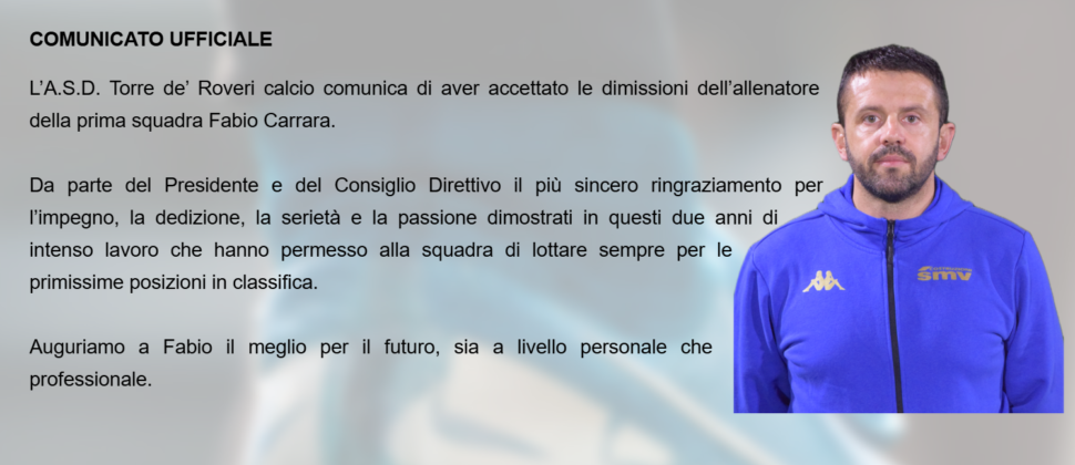 giovedì 8 Maggio 2025UFFICIALE – Il Torre de’ Roveri accetta le dimissioni di mister Carrara