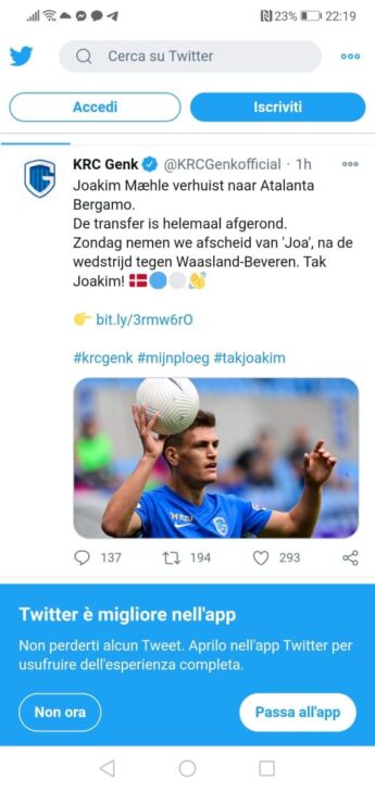 è ufficialmente un giocatore dell’Atalanta. A comunicare la definizione della trattativa per l’esterno danese, classe 1997, è il Racing Genk, precedente proprietario del cartellino del giocatore. “Joakim Mæhle si trasferisce all’Atalanta Bergamo. Il trasferimento è completo – si legge -. Domenica salutiamo ‘Joa’, dopo la partita contro il Waasland-Beveren. Grazie Joakim”. Il laterale di piede destro, in grado di giocare su entrambe le fasce, è costato 10 milioni più 5 complessivi di futuri bonus legati a presenze e rendimento.